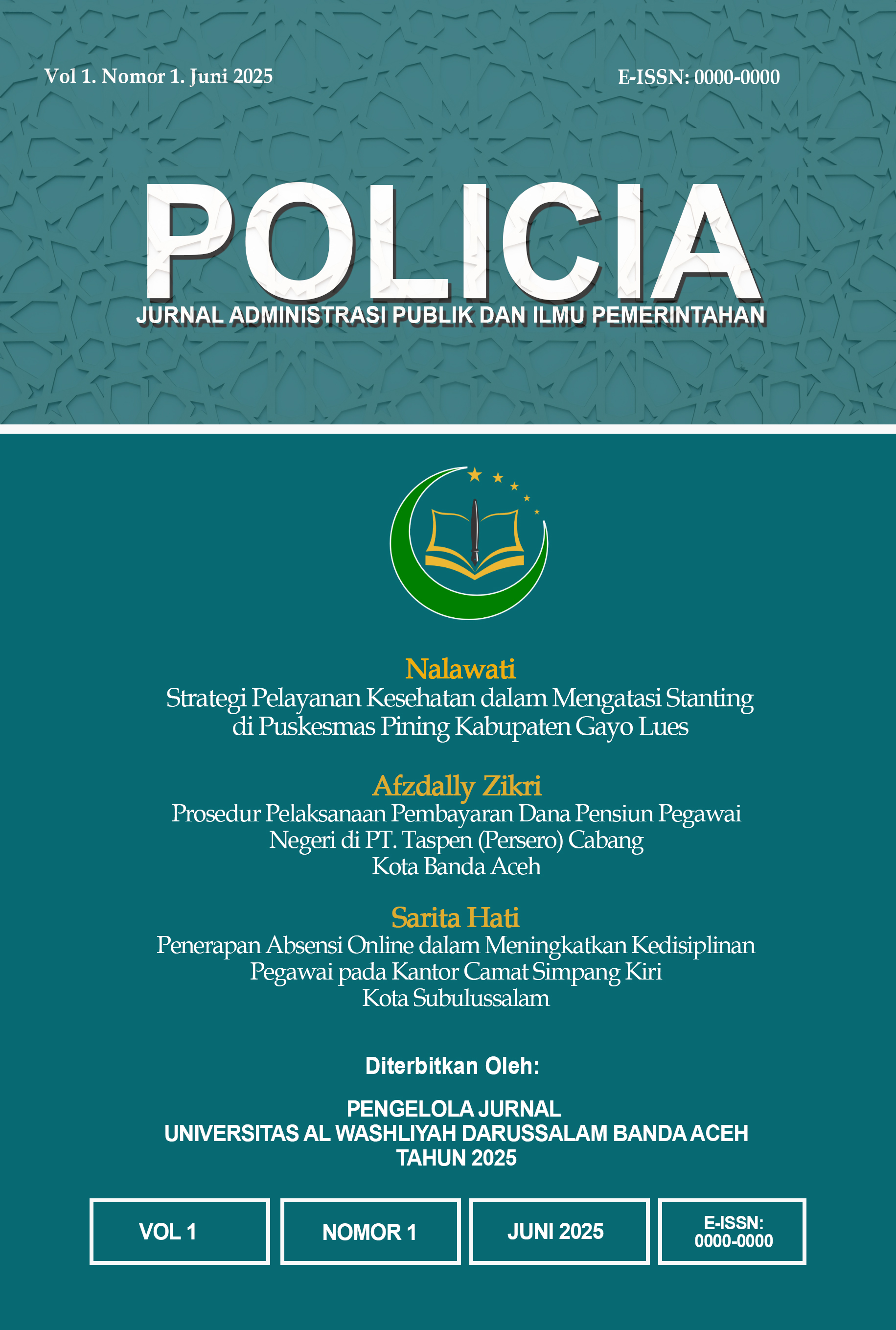 Vol. 1 No. 2 (2025)Policia: Jurnal Administrasi Publik dan Pemerintahan diterbitkan oleh Program Studi Ilmu Administrasi Negara, Fakultas Ilmu Sosial dan Ilmu politik Universitas Al Washliyah Darussalam Banda Aceh. Jurnal ini menerbitkan artikel di bidang Administrasi Publik, analisis kebijakan publik, tata kelola pemerintahan, reformasi birokrasi, manajemen pelayanan publik, dan dinamika kepemerintahan. Jurnal ini terbit dua kali setahun yaitu pada bulan Juni dan Desember. E-ISSN: 0000-0000